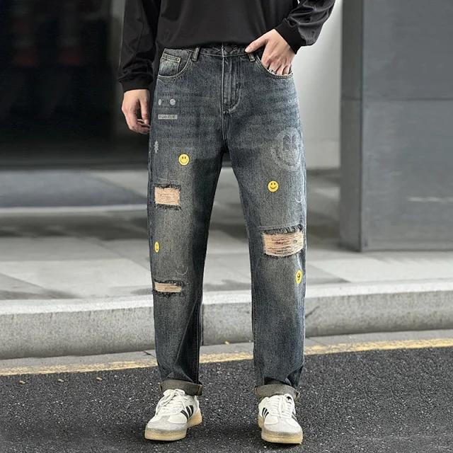 Smiley Face Ripped Patch Retro Casual Denim Jeans