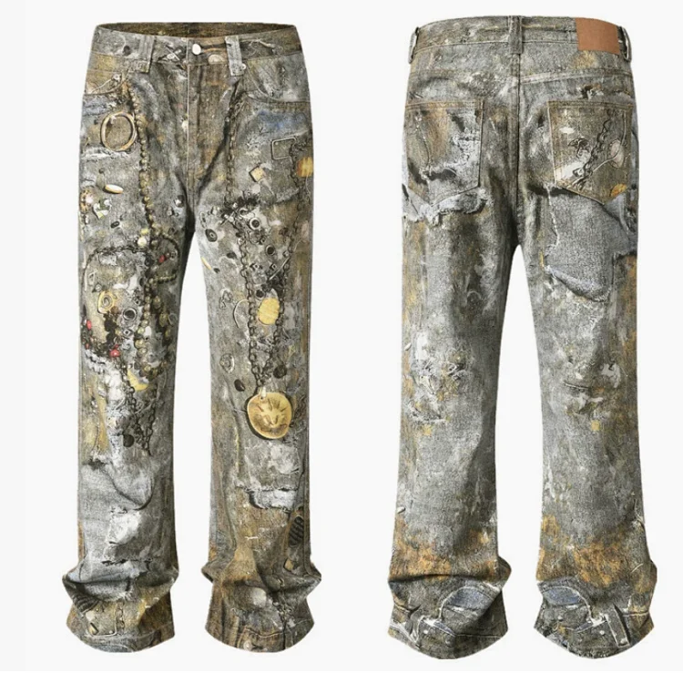 European and American high street American trendy men's and women's multi-bag cargo trousers, straight leg casual loose ripped pants