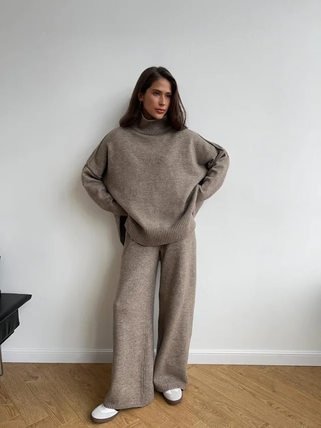 Women's Turtleneck Split Sweater Set, Loose Casual Lazy Knit Pants Two-Piece Set 1